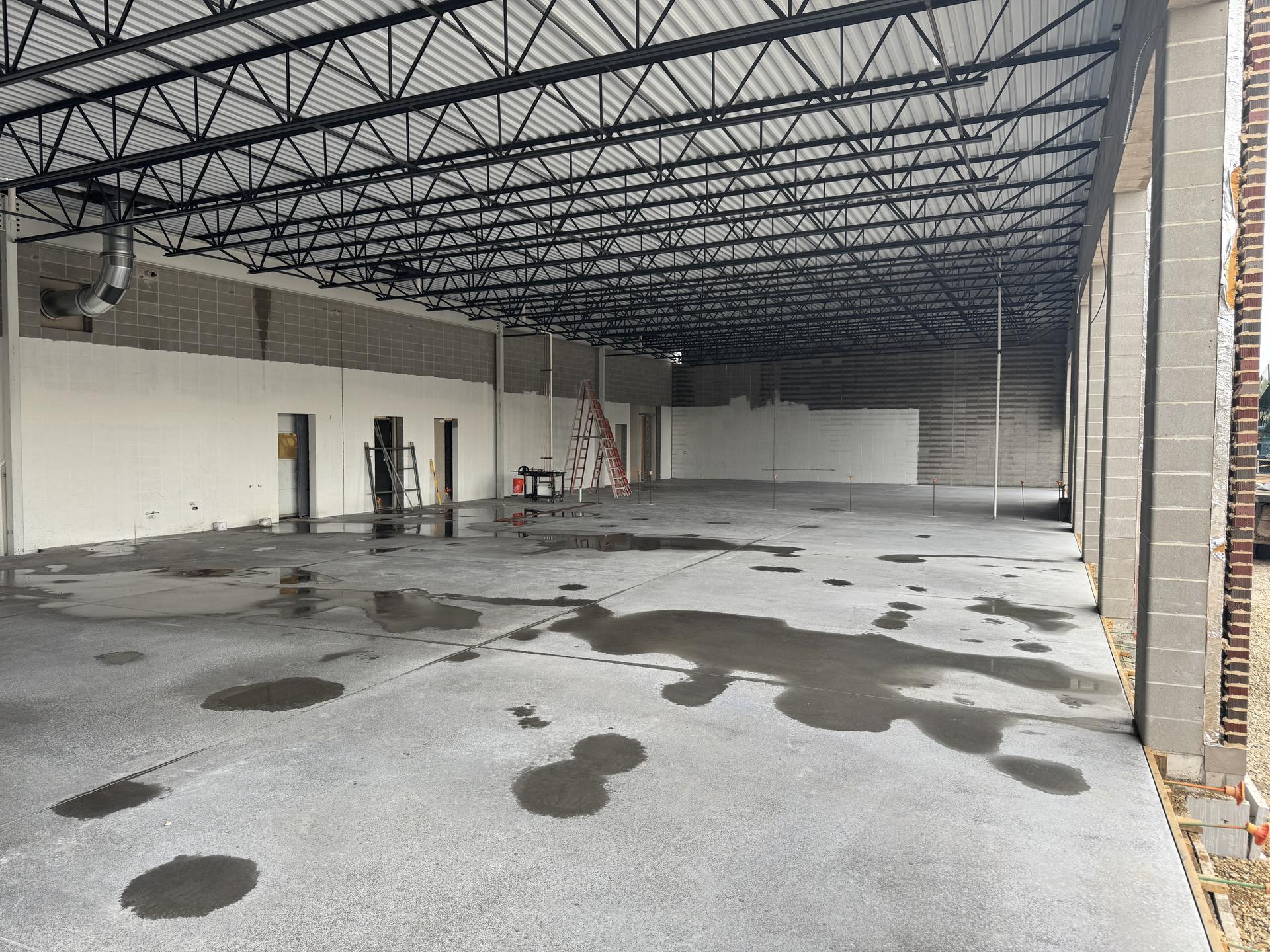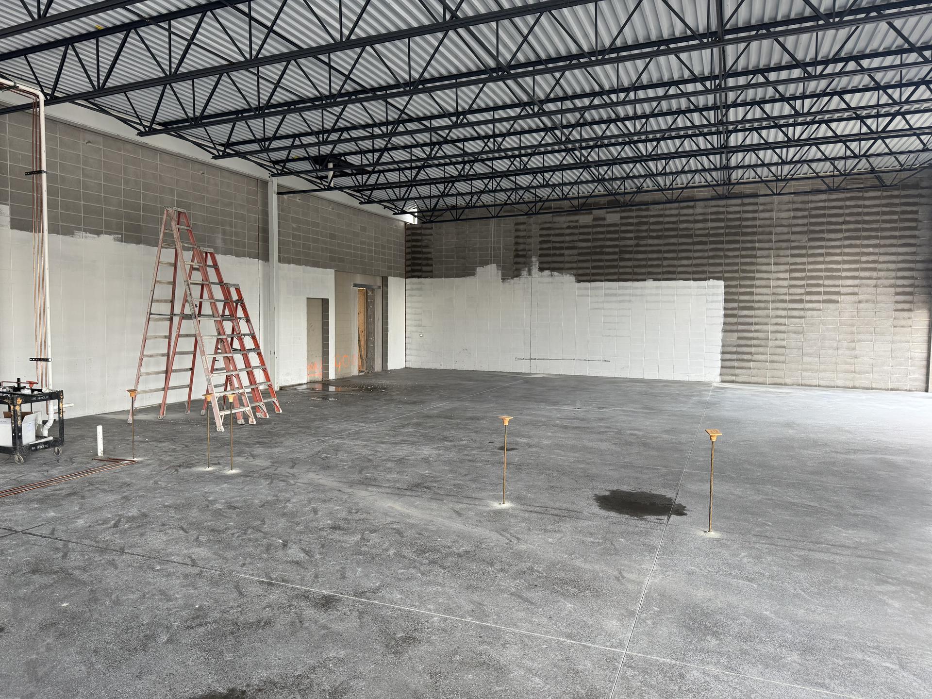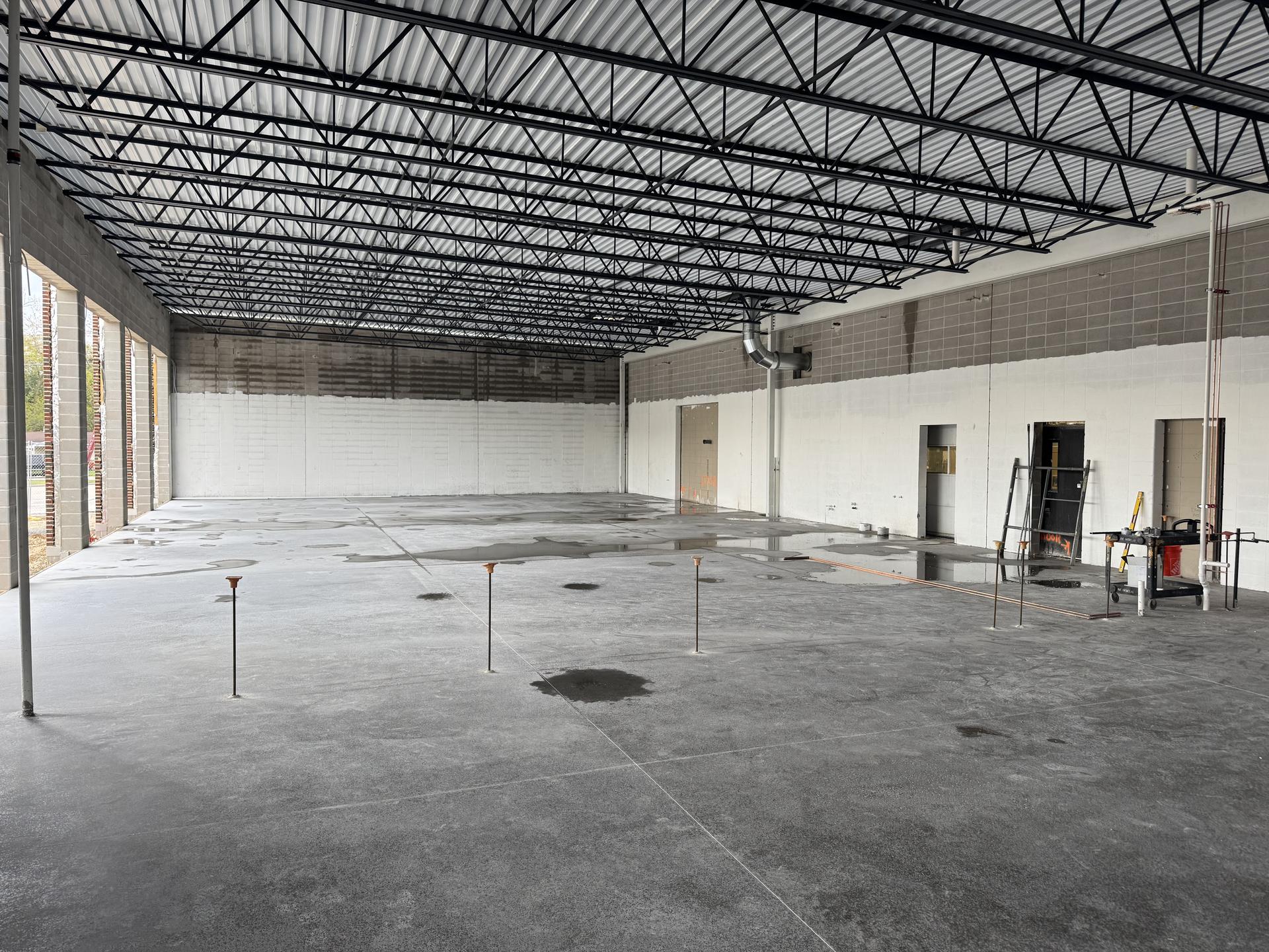 The slab has been poured. CMU partition wall construction is scheduled to begin shortly. Plumbing rough-in work is underway.