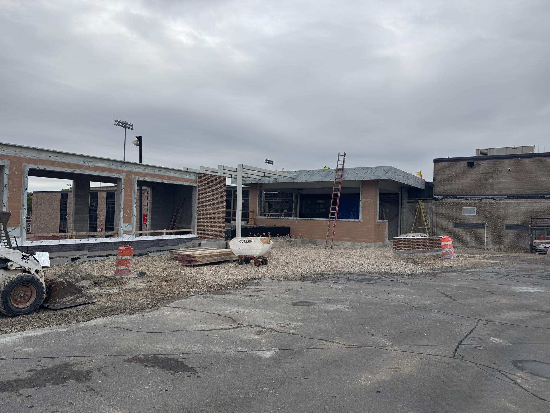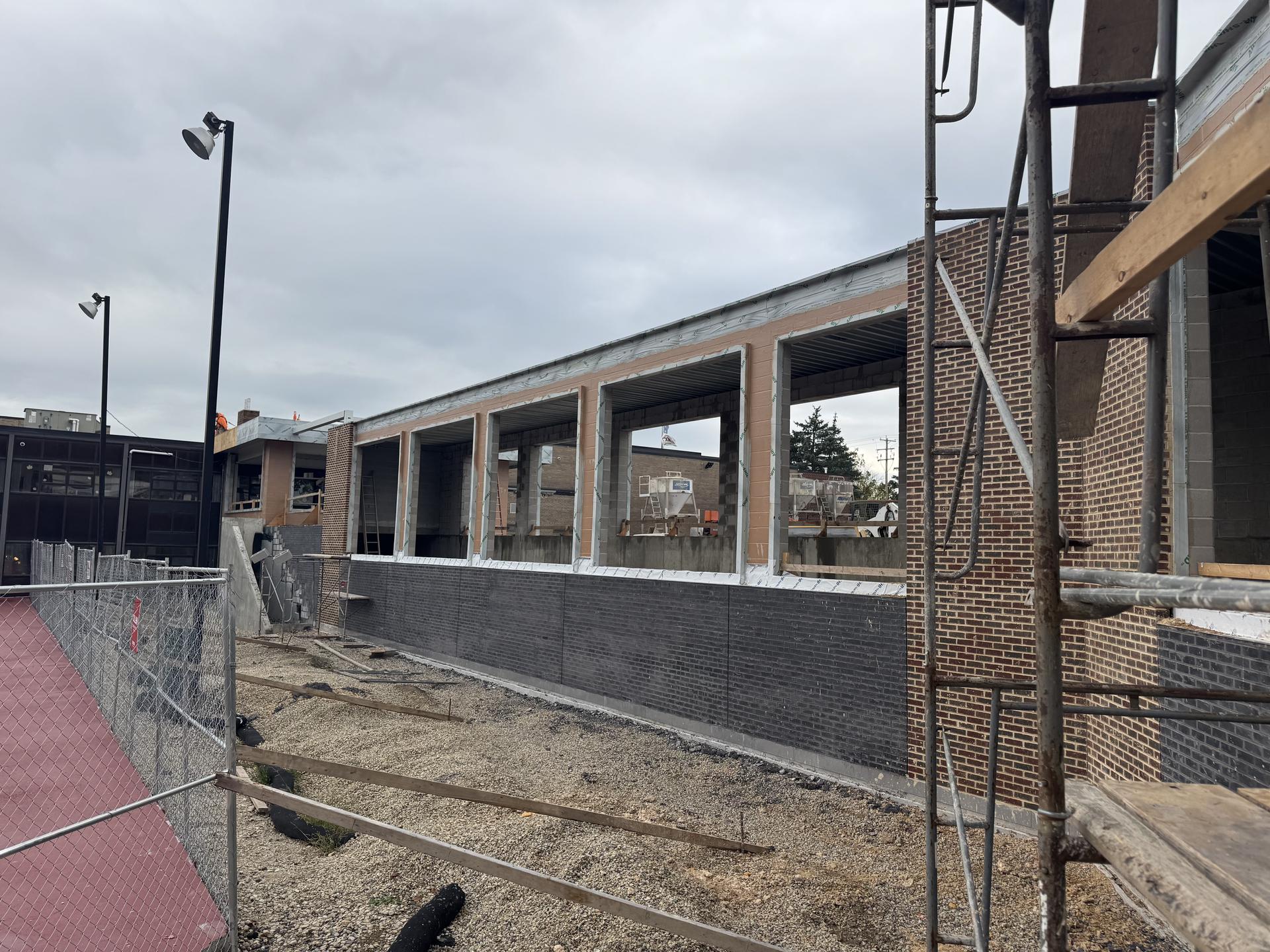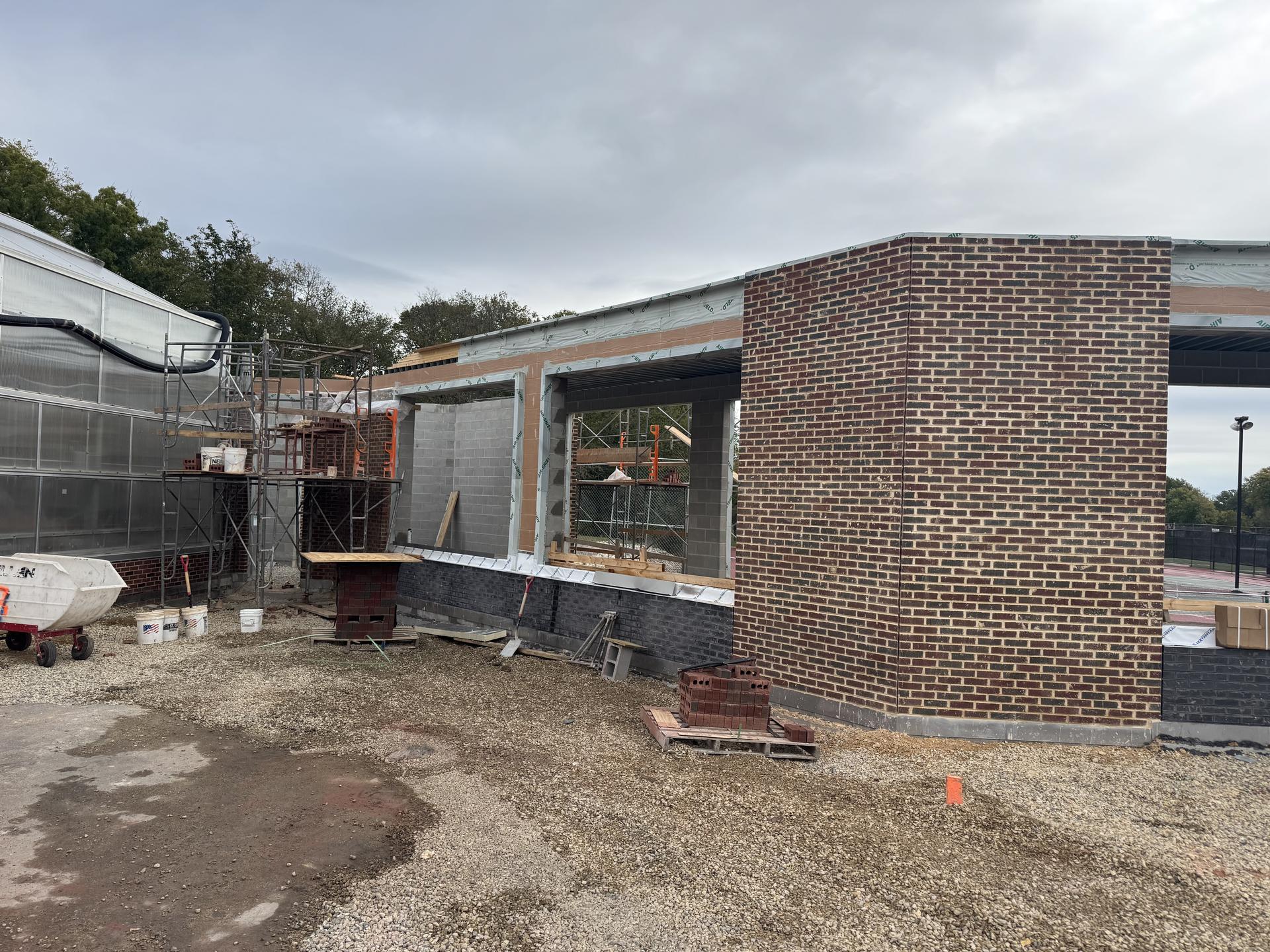 Brick veneer installation is nearly complete. Electrical rough-in work is ongoing. The MEP tie-in to the greenhouse has been demolished back, allowing for completion of the new structure. Roofing crews have begun tying into the existing building.