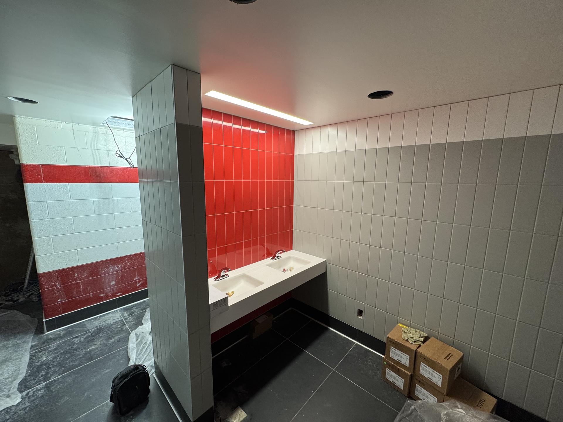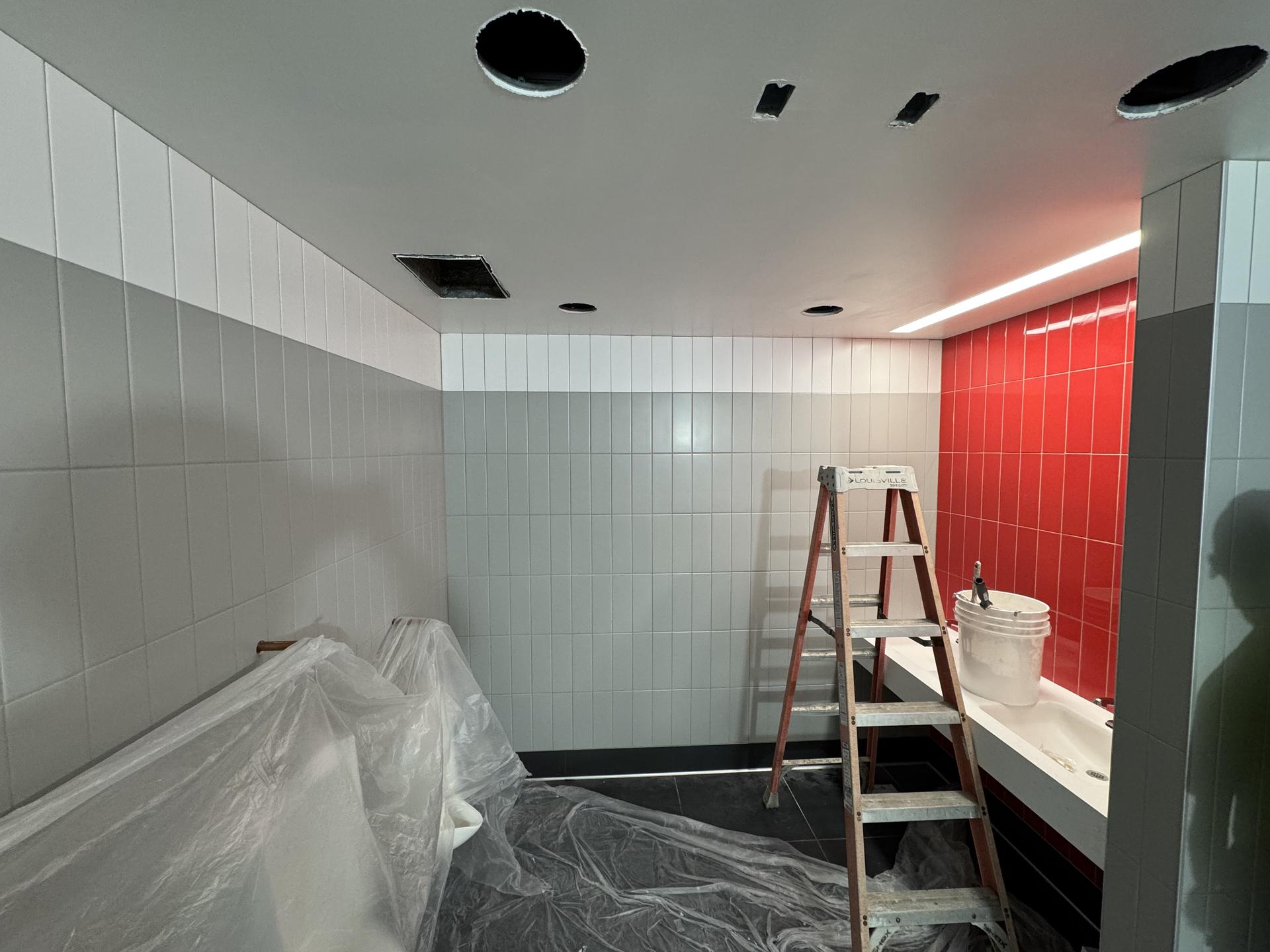Tile installation is complete, allowing finish work to begin. Upcoming activities include installation of trim and completion of the punch list.