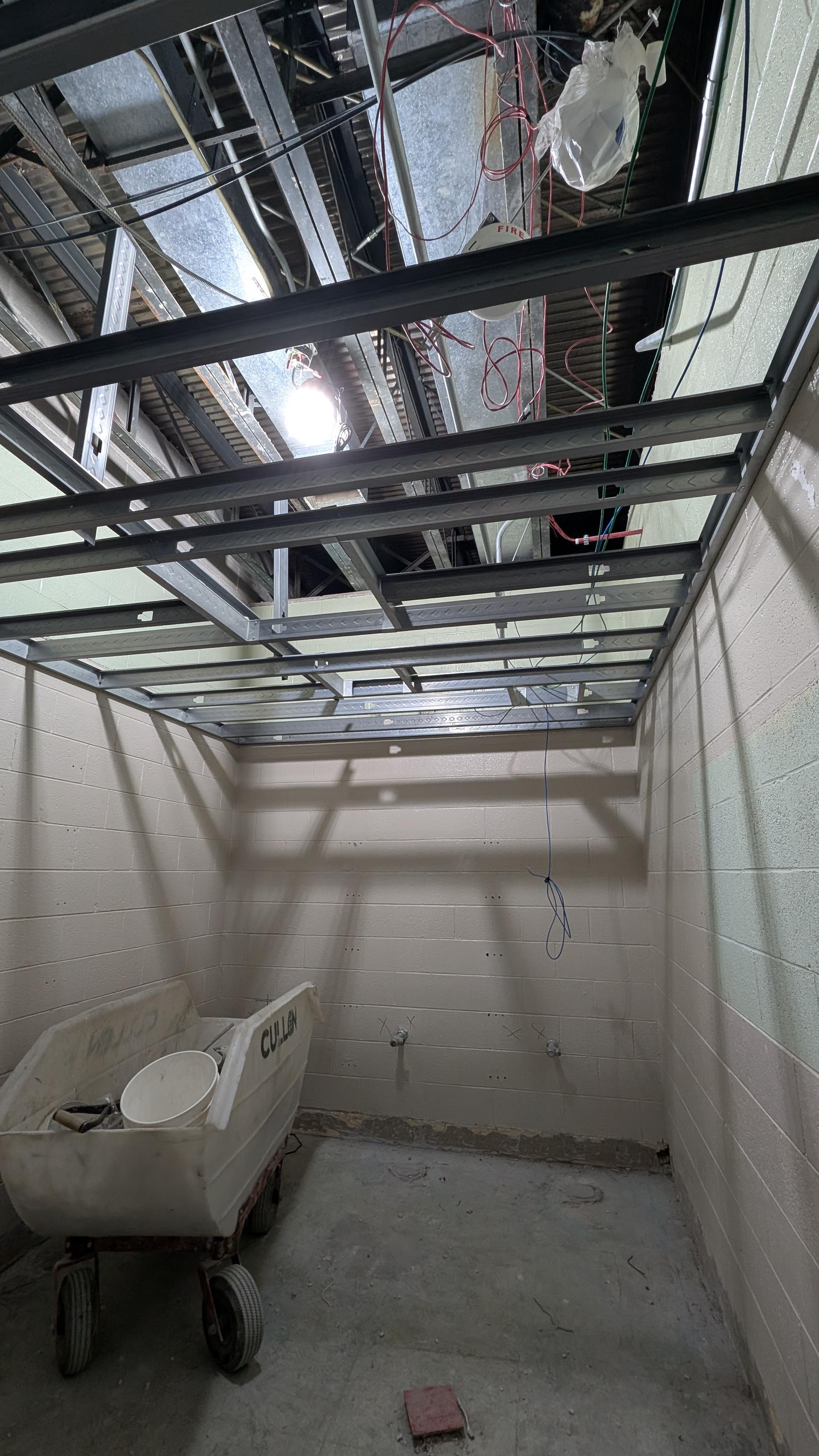 Demolition work has been fully completed, clearing the area for new construction activities. Ceiling framing has been installed, establishing the layout for future mechanical, electrical, and plumbing installations above the ceiling. Crews will begin rough-in work for plumbing fixtures, exhaust, lighting, and other utilities in the next phase.