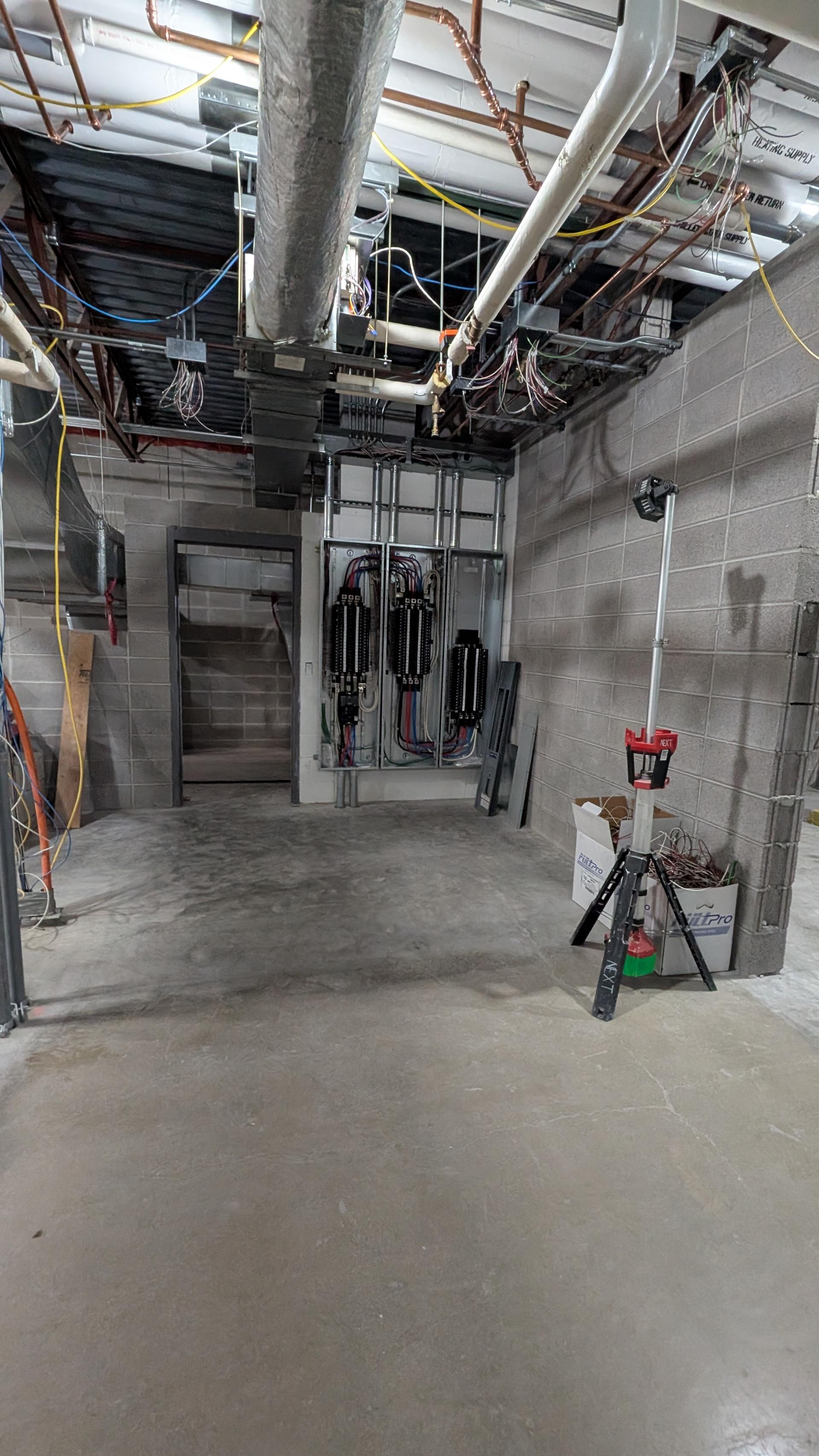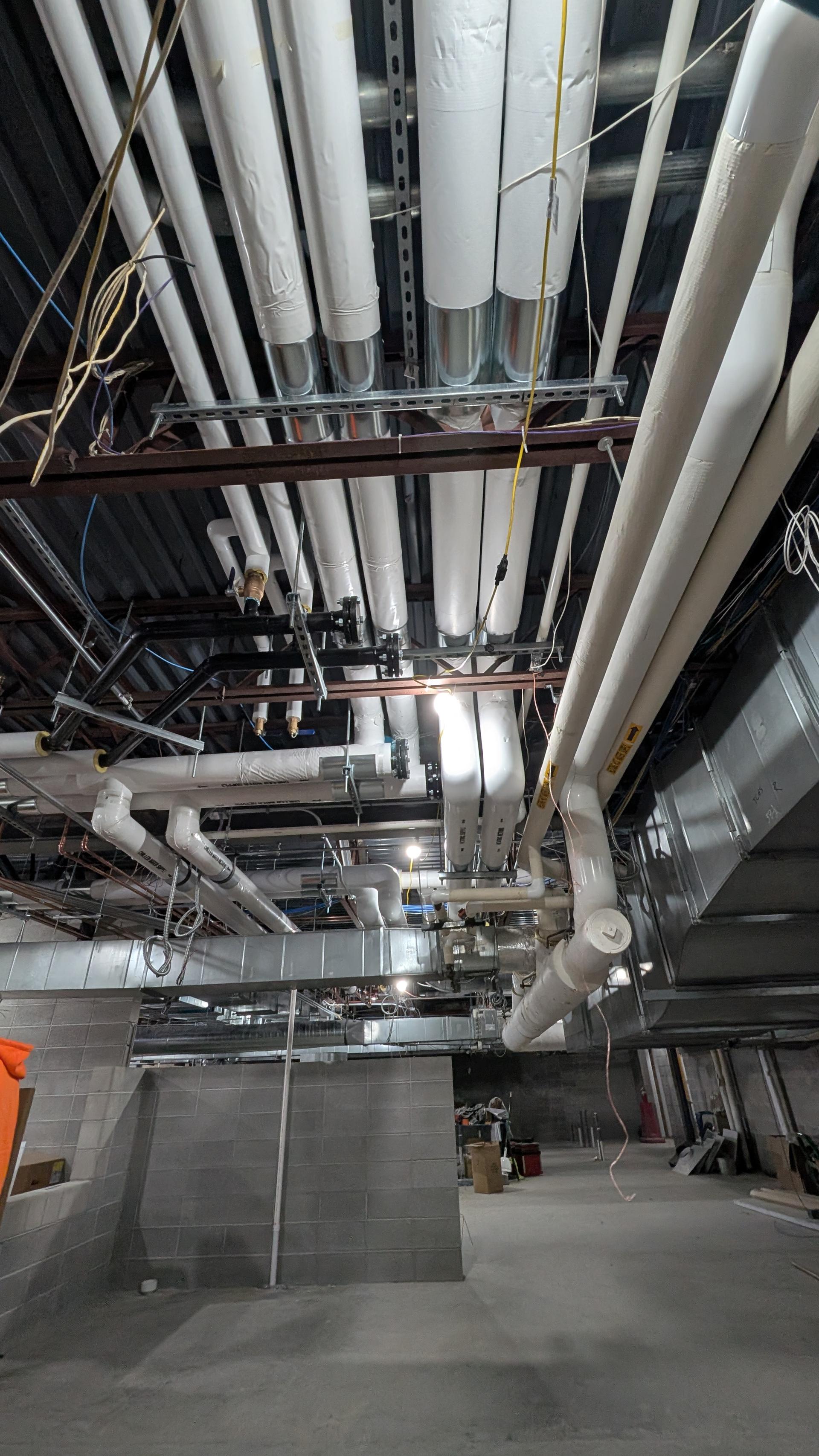 Insulation of the HVAC piping is ongoing to ensure proper thermal protection and system efficiency. Ductwork connections have been completed in preparation for the installation and commissioning of the DOAS units. Work on the electrical panel is progressing, with electricians continuing wiring and termination activities to support upcoming equipment start-ups and lab utilities.