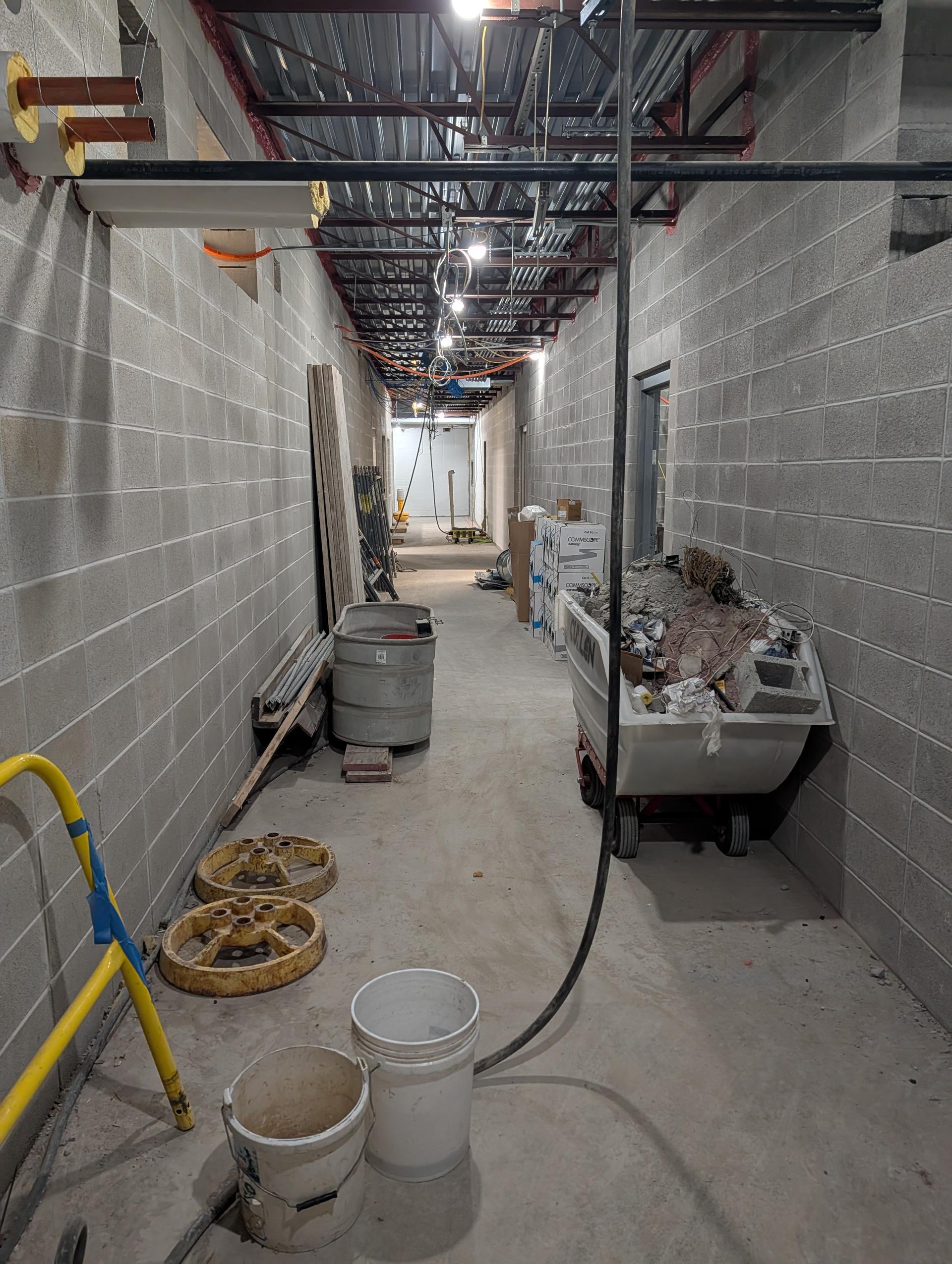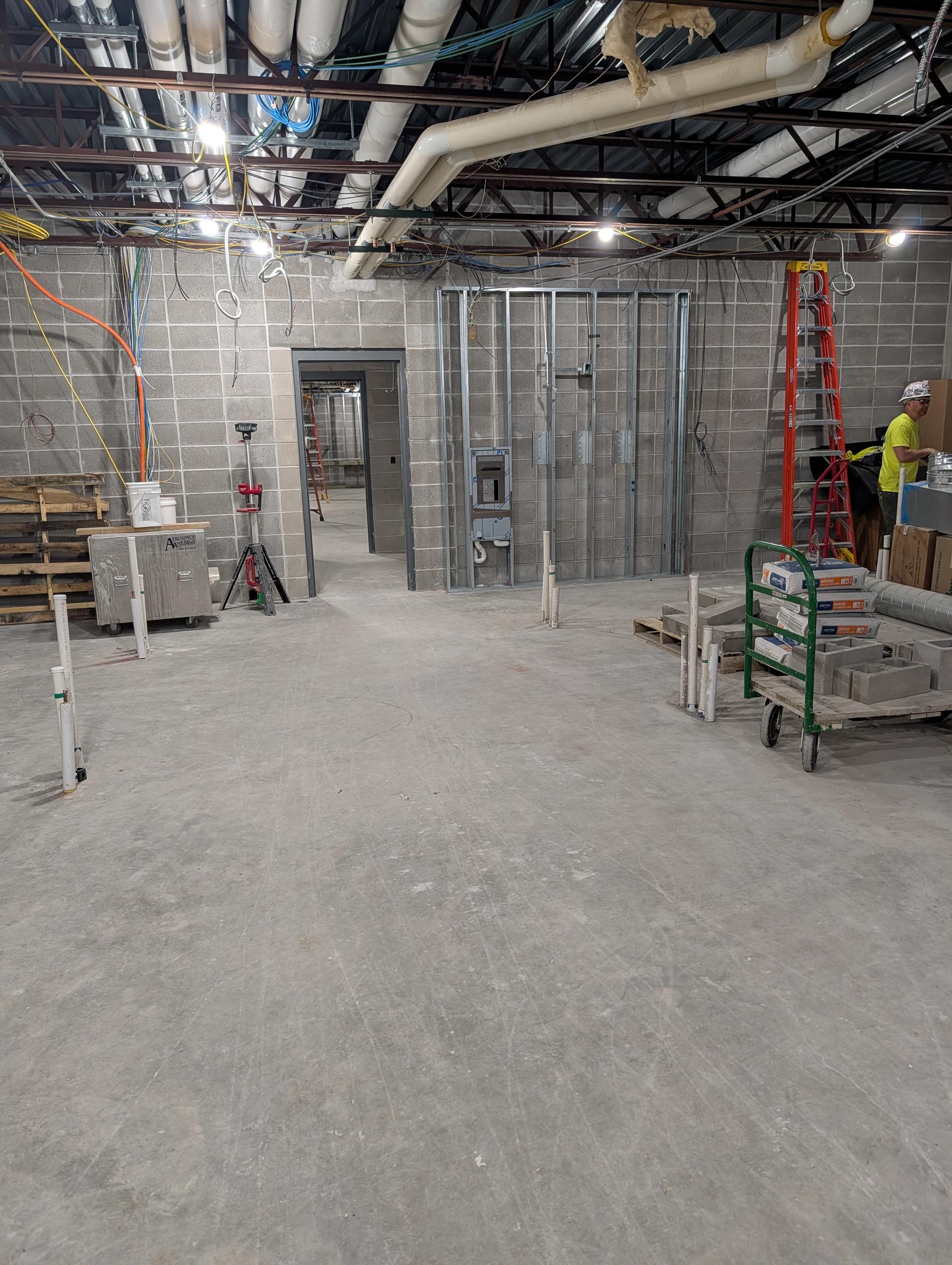 Masonry & Utilities: With the concrete partitions now fully capped, Mechanical, Electrical, and Plumbing trades are deep into the "rough-in" phase, running conduit and piping through the walls before they are sealed or painted.